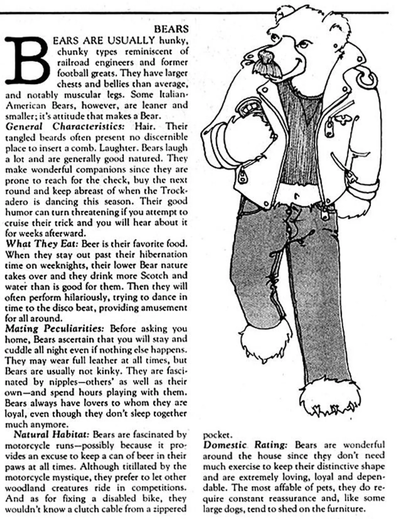 Bears did not materialize out of nowhere. The idea of gay bears was a matter of the Zeitgeist. In his 1979 article “Who’s Who at the Zoo?” in The Advocate George Mazzei defined bears as having “larger chests and bellies than average, and notably more muscular legs … like some large dogs, tend to shed on the furniture…Bears laugh a lot and are generally good natured. They make wonderful companions since they are prone to reach for the check, buy the next round and keep abreast of when the Trockadero is dancing this season.” (I don’t recall any bears rushing to pick up my check.) Notably, Mazzei’s bear sports a 1970s clone moustache, not a full beard.