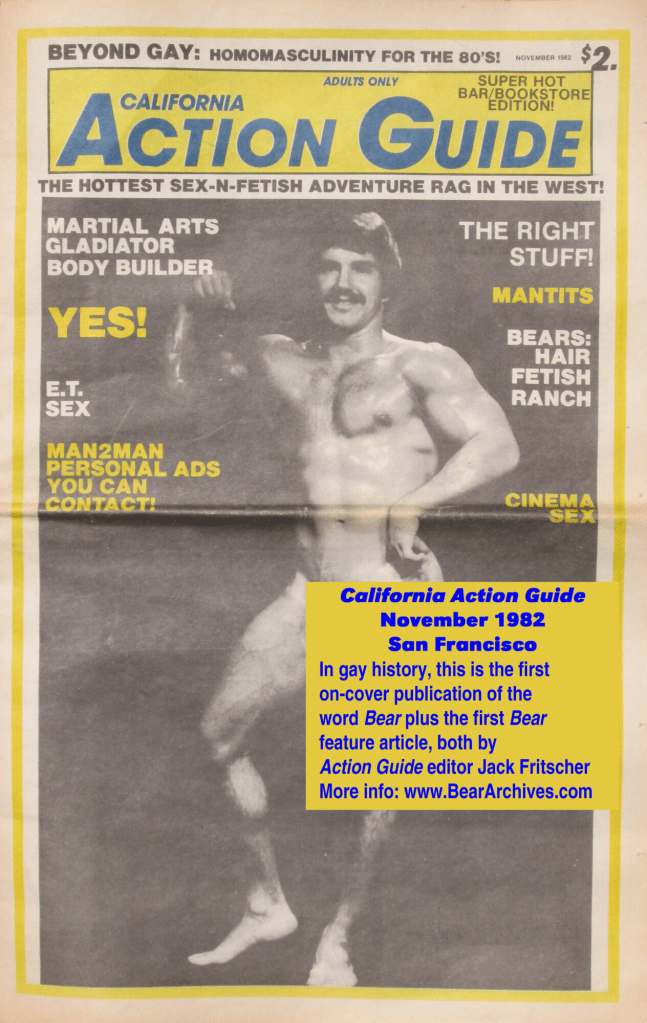In Bear Book II, Jack Fritscher (best known for his role in the leather community) lays out his “genome project” of tracing gay bear roots back to the 1960s. He was the first to publish the word “bear” on the California Action Guidemagazine cover in 1982.