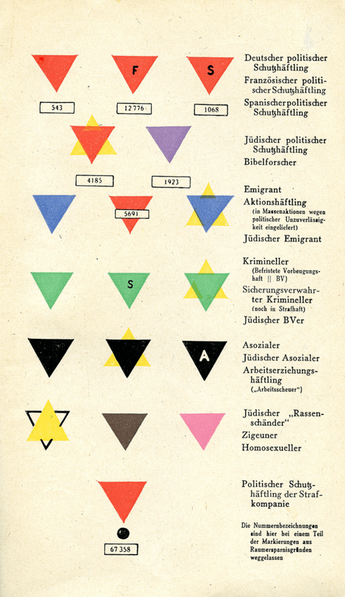 As Paragraph 175, which made homosexuality illegal, was intensified and more actively enforced, the first gay prisoners were sent to concentration camps. Here prisoners were required to wear a color-coded triangle signifying the category of the reason for their imprisonment. The yellow Star of David (two overlapping triangles) signified Jew. The pink triangle signified homosexual man. The black triangle was for Asoziale, which included alcoholics, homeless people and lesbians. Transgender individuals were assigned either the pink or black triangle. In these death camps homosexual men “experienced some of the worst conditions that humans have ever been forced to endure.” Jews and homosexuals were ranked at the bottom of the prisoner hierarchy. Homosexuals were shunned even by Jewish fellow inmates due to widespread homophobia. Homosexual Jews fared the worst of all. Sociologist Rüdiger Lautmann estimated that 60% of gay prisoners died.